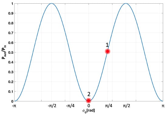 The sinusoidal detector response, shown in Figure 2, indicates the half fringe () as the best working point for the detector since the derivative is maximum and the sensitivity to a small displacement is the highest. Nevertheless, in this point, any fluctuation in the laser power causes a variation of the power measured at the output of the instrument, which can be mistakenly interpreted as the consequence of a GW passage.