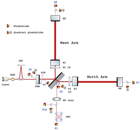- van der Schaaf, L.; Agatsuma, K.; van Beuzekom, M.; Gebyehu, M.; van den Brand, J. Advanced Virgo phase camera. J. Phys. Conf. Ser. 2016, 718, 072008. [Google Scholar] [CrossRef]