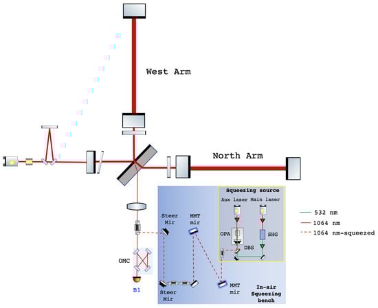 - Mehmet, M.; Vahlbruch, H. The Squeezed Light Source for the Advanced Virgo Detector in the Observation Run O3. Galaxies 2020, 8, 79. [Google Scholar] [CrossRef]