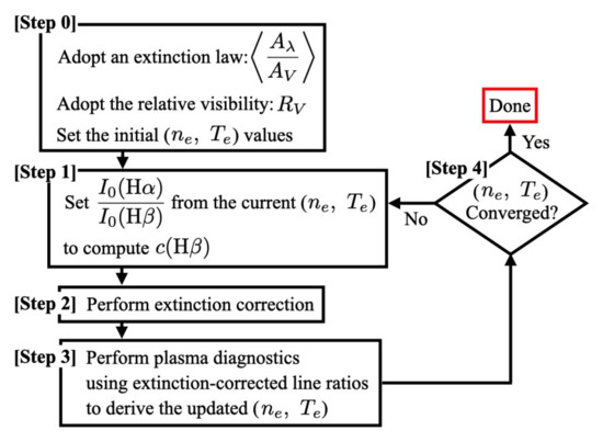 Therefore, to overcome the conundrum pointed out above, both plasma diagnostics and extinction correction ought to be performed together as a streamlined iterative numerical process. This is, in fact, suggested even when the present procedure of plasma diagnostics was introduced to the community [1,2]. However, what has been traditionally exercised in the literature is to adopt a number of approximations to make the problem analytically tractable (which was performed originally for instructional purposes [1,2]). Moreover, ad hoc and are often adopted to force a value of or an ad hoc value may even be adopted to skip extinction correction altogether.
