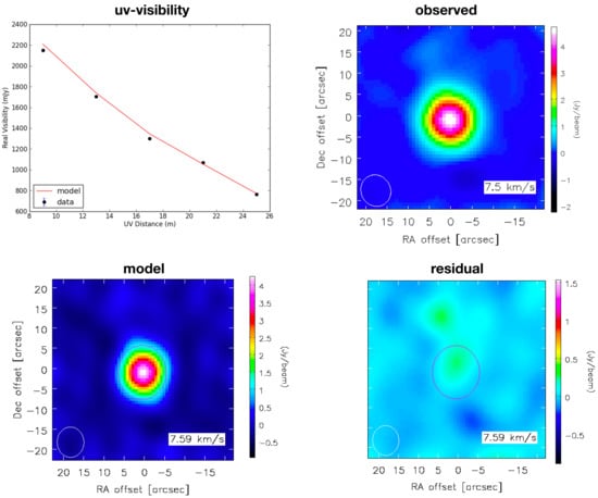 We fit a Gaussian emission distribution model to the interferometric visibilities of the sources in our sample in CO (2–1) and CO (3–2) in each velocity channel using the uvmultifit library implemented in casa [26]. For each run, uvmultifit outputs the position, flux, major axis, ratio between minor and major axes, and the position angle of the major axis of the fitted Gaussian. Measuring the CO size in the uv-plane minimizes the effects of artifacts introduced by the beam and permits obtaining better size estimates for the smallest sources. This method also allows explicit examination of the quality of the data, so that effects from the limitations of the carried observations (e.g., missing flux and unresolved source) can be easily distinguished from possible physical effects. As an example, Figure 1 illustrates the measurement of the CO(2–1) size for TT Cen using uvmultifit, showing the observed data and best-fit Gaussian model to the visibility.