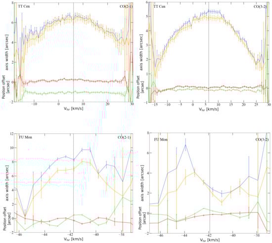 Results from the visibility fitting to the data measured towards TT Cen (top) and FU Mon (bottom) [20] in bands 6 (left) and 7 (right). The source name is given in the upper left corner, and the transition is in the upper right corner of each plot. The upper blue and orange lines show the major- and minor-axis widths of the best-fitting Gaussian in each channel, respectively. The lower red and green lines show the RA and Dec offset relative to the center position, respectively.
