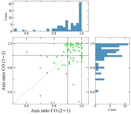 Minor/major axis ratio in CO(2–1) and CO(3–2) taken at the center velocity channel for all the sources in our sample. The dotted line represents the 1-to-1 relation. The black dashed lines show the limits of an axis ratio equal to unity within 10 percent, and the red dashed lines highlight an axis ratio equal to 1.