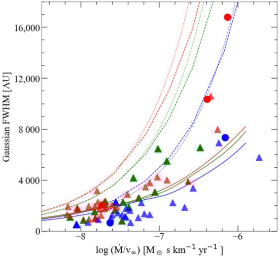 Major axis of the best-fitting Gaussian at the central velocity channel of the CO (2–1) emission as a function of a proxy of circumstellar density [19,20]. The triangle symbols show the sources observed with ACA-only, while the round symbols represent those for which we have TP observations. The C-, S-, and M-type stars are red, green, and blue, respectively. The dashed lines show the photodissociation diameter of C-type, S-type, and M-type stars from Saberi et al. [22]. The dotted lines are the fits to the CO photodissociation sizes from Mamon et al. [21]. The solid lines represent the expected Gaussian FWHM of the CO(2–1) line obtained from radiative transfer modeling of the results of Saberi et al. [22].