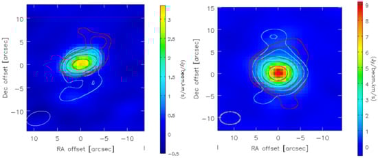 Figure 4 shows the dependence of the derived sizes with the outflow density, defined as the ratio between the mass-loss rate and expansion velocity taken from previous studies [28,29,30,31]. We found that, for a density lower than ∼5s km yr, the envelope sizes of three carbon stars were up to a factor of two larger than the sizes predicted by photodissociation theory, while the CSEs of M-type stars tended to be smaller than the CO photodissociation sizes. We found a median CSE size of AU for all three chemical types at low density and based on the distances collected from Schöier and Olofsson [28], González Delgado et al. [29], and Ramstedt et al. [31]. The size-density dependence was steeper at higher density, and the C- and S-type stars were almost all larger than expected. A number of the CSEs of the high-mass-losing S-type stars showed strong signs of anisotropy that cannot have been created by a smooth wind and are larger than expected based on their CO abundances when compared to the M- and C-type CSEs. This is the case for FU Mon and RZ Sgr, whose CO emission reveals outflows in opposite spatial directions in the red- and blue-shifted velocities, as shown in Figure 5. These large- and small-scale asymmetries have likely influenced the Gaussian fitting, making the derived sizes unreliable for these sources.