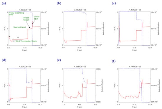 The number density (red line) and ionization fraction (blue line) at various times, from the spherically symmetric simulation. The left scale in each panel is the logarithm of the number density , defined as ) where is the gas density. The right hand side is the ionization fraction, stretching from a value close to zero (almost neutral) to 1 (fully ionized). The stellar evolution time (age of the star) in years is given at the top. Panels (a,b) refer to the MS phase, panels (c,d) to the RSG phase, and panel (e,f) to the W-R phase.