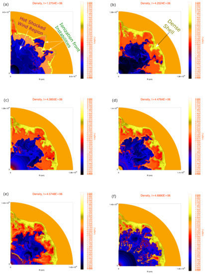 The density structure of the wind bubble from the 2D simulation. The scale in each panel is the logarithm of the number density , defined as ) where is the gas density. The stellar evolution time in years is given at the top. Similar to Figure 1, panels (a,b) refer to the MS phase, panels (c,d) to the RSG phase, and panel (e,f) to the W-R phase. The hot shocked wind region (dark blue) becomes very asymmetric in shape as the simulation proceeds. The growth of ionization front instabilities in the MS phase, instabilities at the inner edge of the dense shell, and at the interface between the hot shocked wind region and the ionized HII region, is clearly seen, and is described in the text.