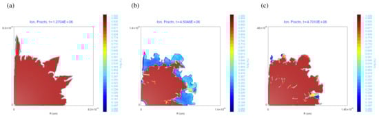 The subsequent RSG wind has a much lower velocity than the MS wind, a higher mass-loss rate and a lower temperature. Therefore, it doesn’t expand far into the MS wind, as seen in the 1D simulations, and piles up against the MS wind. It tries to form a new pressure equilibrium within the MS shell, although this may not always be possible. Hydrodynamically, the RSG wind will also be unstable, as shown in Dwarkadas [18]. Unfortunately this is not easily visible in Figure 2c,d without zooming in on the wind region. An important aspect here is that the RSG wind is unable to keep the HII region ionized, therefore it begins to recombine, as seen in Figure 3b, which shows the ionization fraction of the wind bubble in the RSG phase. Depending on the length of the RSG phase, and the number of ionizing photons, the HII region may have enough time to become almost completely neutral. In this particular case, by the end of the RSG phase, the ionization fraction of the HII region has decreased to around 25–30%. Since the wind does not travel far, the shape and structure of the hot bubble or the HII region are not significantly affected in this phase.