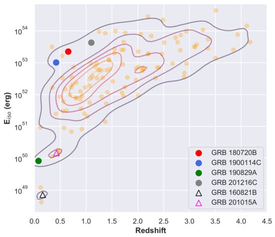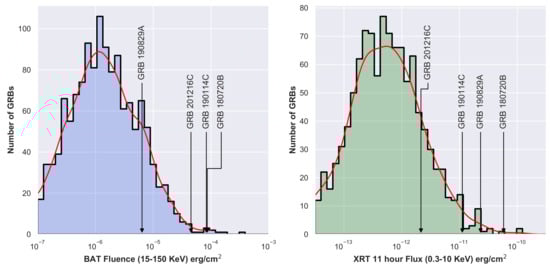 | 1 | Data from https://swift.gsfc.nasa.gov/archive/grb_table/ [accessed on 2 September 2021]. |