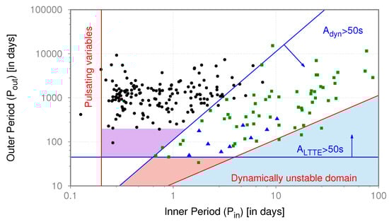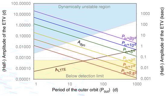 The dependence of the LTTE and DE amplitudes ( and , respectively) on the inner and outer orbital periods (adapted from Figure 7 of Rappaport et al. []). The amplitudes were calculated with the use of Formulae (4) and (6). The masses of all three of the components were set to , , , and . The border of the dynamically unstable region was calculated according to the approximate formulae of Mardling & Aarseth []. The limit of the certain detection was arbitrarily set to 50 s.