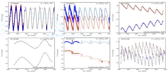 Examples of ETVs amongst ECHTs in the original Kepler-field. Primary and secondary eclipses are denoted by red circles and blue boxes, respectively. The continuous curves represent the analytic ETV solutions according to the model described in Borkovits et al. []. The ETV curves from left to right, and then up to down, represent the following ECHTs: KIC 8043961 ( d; d): LTTE dominated ETV. The EB’s orbit is circular (hence, there is no shift in the secondary minima), the outer orbit is moderately eccentric. (The few solo points in between the four-year-long Kepler (to the left) and three sectors of TESS data are (as of yet) unpublished minima points from the follow-up photometry of Baja Observatory, Hungary)—KIC 4909707 (2.30; 515): the LTTE and DE amplitudes are similar. The shift of the secondary eclipses indicates an eccentric inner orbit (No apsidal motion is detectable). The strong asymmetry of the ETV is a sign of a highly eccentric outer orbit—KIC 7289157 (5.27; 243): at first glance, this ETV mimics an LTTE; however, it is clearly dominated by DE (). Upon closer inspection, one can see that the shape of the secondary curve differs significantly from the primary one, clearly violating the second criterion of Frieboes-Conde & Herczeg []. The converging primary and secondary curves imply rapid apsidal motion. The eclipse depth of this triply eclipsing system decreased continually over the Kepler lifetime and the system no longer exhibits eclipses during the TESS era. (Hence, no ETV data can be extracted from the TESS observations)—KIC 10319590 (21.32; 452): the ETV curves cover only one outer period, since the eclipses suddenly disappeared. The different amplitudes of the primary and secondary ETV curves, as well as their characteristic double-bumped nature, the latter of which is a common feature of moderately inclined () systems, are clearly visible. The LTTE contribution is practically negligible compared to the DE ()—KIC 5731312 (7.95; 919): due to the higher inner and outer eccentricities, one of the two ETV bumps turns into a sharp spike (indicating the periastron passage of the outer body), while the other bump becomes much shallower. The shape of the two curves differs strongly. Moreover, the apsidal motion of the inner EB is clearly detectable. The eclipse depth is decreasing continuously. By the time of the TESS measurements, the secondary eclipses are completely missing. Primary eclipses will also disappear in the near future—KIC 5771589 (10.74; 113): one of the tightest ECHTs in the Kepler sample. The extremely rapid apsidal motion ( yr) is quite apparent. This ECHT has also a similarly short nodal period ( yr).
