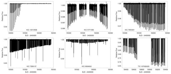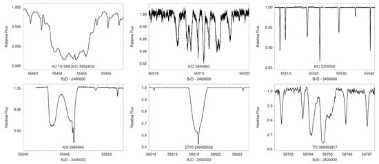 In addition to the two above-mentioned systems, and not counting the case of the transiting circumbinary planets (see below), Kepler observed clear third-star eclipses in nine additional systems during its prime mission (see Table 1). Amongst these, KIC 2856960 displays the strangest and most mysterious extra eclipse patterns every 204 days (Armstrong et al. []—see upper middle panel in Figure 4). As Marsh et al. [] pointed out, it is an ‘impossible triple star,’ as the complex structure and duration of the extra eclipses cannot be explained by eclipses from only a ‘simple’ third star. They made efforts to model these eclipses in the context of both 2 + 1 + 1 and 2 + 2 quadruple star models, however, they were unable to find physically realistic solutions. KIC 5255552, the second longest outer period triply eclipsing system (upper right panel of Figure 4), might also be a quadruple star (see Getley et al. []). Attempts to find reliable quadruple solutions for that system are in progress. Another curious system is KIC 4150611, whose light curve, in addition to third-body eclipses, also exhibits three sets of regular two-body eclipses, and stellar pulsations as well (Shibahashi & Kurtz []). According to the detailed study of Hełminiak et al. [], this target is most probably at least a quintuple stellar system. Note also KIC 2835289, a CHT which exhibits third-body eclipses, even though the inner binary itself is only an ellipsoidal variable without eclipses (Conroy et al. [,]). Finally, on this topic, we note that Orosz [] reported one low-amplitude extra eclipse in the light curve of KIC 7670485. Hence, Borkovits et al. [] investigated the eclipse times of all the regular eclipses during the four-year-long Kepler data set, but did not find any ETVs. Therefore, the origin of that sole extra eclipse remains uncertain, and we do not consider this system to be a secure triply eclipsing CHT.