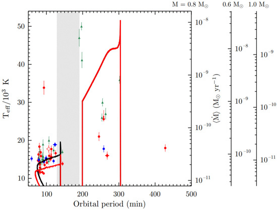 The WD effective surface temperature as a function of the orbital period from [15] (red and blue dots) and from [14] (green, non-magnetic system). The vertical light gray band represents the period gap between 2 and 3 h. The solid lines represent the evolutionary tracks for a system with a WD accreting from a donor with an initial mass of , and an initial orbital period of 12 h. The red track was generated with the classical recipe for CV evolution (gravitational wave radiation only below the period gap), while the black track includes a residual magnetic braking equal to the gravitational radiation AML when the donor has no radiative core. The two tracks overlap above the period gap. To the right of the panel is projected a mapping to <> from [14] for and , respectively. Note the paucity of CV systems with exposed WD above the period gap. The number of CVs with exposed WDs above the period gap is only 20% of the CVs below the period gap. This figure was taken from [15].