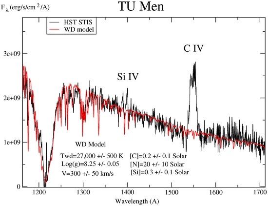 Modeling the WD in TU Men. The HST STIS FUV spectrum of TU Men (in black) is fitted with a synthetic stellar spectrum (in red). The results of the model fit, for a Gaia distance of 277 pc, give an effective surface gravity of , with an effective surface temperature of K. The elemental abundances are varied one by one together with the projected rotational stellar velocity. The fitting of the lines yields a carbon abundance of , silicon abundance of , and nitrogen abundance of , all in solar abundances (sun = 1). The resulting projected stellar rotational velocity from the lines is km/s.