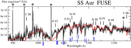 A WD model fit (solid red line) to the FUSE spectrum of SS Aur (black line) obtained at quiescence on 13 February 2002, 28 days after outburst. The sharp emission lines are geocoronal in origin. We identify broad emission lines from the O vi doublet (∼ Å), and C iii (977 Å), not forming in the photosphere. Moderate ISM () absorption lines are marked in blue. The absorption lines and emission lines of the sources are indicated above the spectrum. The WD fit yields K, , , km/s, and a silicon abundance [Si] = 0.5 ± 0.1 solar. The other species were set to solar abundances. The C iii (1175) absorption line is not observed, it could be filled up by emission.