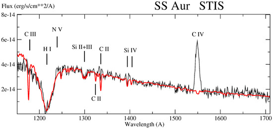 A WD model fit (red line) to the STIS spectrum of SS Aur (in black) obtained at quiescence on 20 March 2003, 34 days after (a different) outburst. The STIS spectrum exhibits strong C iv (∼1550) emission and weak N v (∼1240), C ii (∼1335), and Si iv (∼1400) emission features. The model fit gives: K, , . km/s, and a silicon abundance [Si] = 0.2 ± 0.1 solar. The two spectra were obtained after different outbursts, one year apart, and, consequently, it is not expected that the results will be identical.