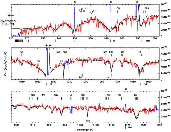 The FUSE spectrum of MV Lyr (in red) obtained in a low state is fitted with a WD stellar model (in black). The model has a temperature of K, Log(g) = 8.23 ± 0.02. The sharp emission lines are geocoronal in origin and are marked with plus sign inside a circle above the panels. There are also some ISM absorption lines from C ii, Fe ii, Ar i, and N ii; all these have been colored in blue and are not modeled. There are some faint emission features from C ii (977), and from the O vi doublet (∼1032 & ∼1038). The remaining absorption lines are all stellar and are marked, and all are well fitted with solar abundances and with a projected rotational velocity km/s. The hydrogen orders of the Lyman series are marked under the panels for clarity. With a Gaia distance of pc, and using the C/O-core WD mass–radius relations from [32], we obtain a white dwarf mass of .
