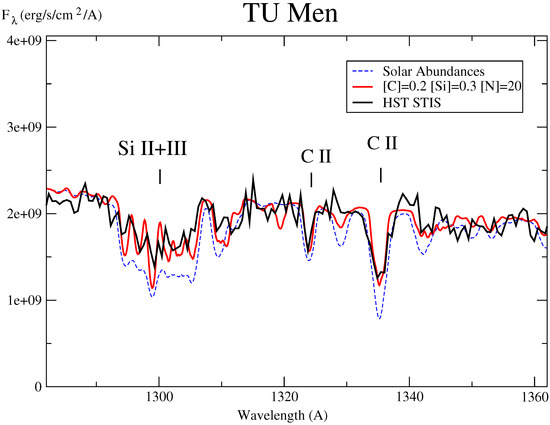 Detail showing the fit to carbon and silicon absorption lines. The HST spectrum is in black, the model is shown in red, and for comparison, a solar abundance model is shown with the blue dashed line.