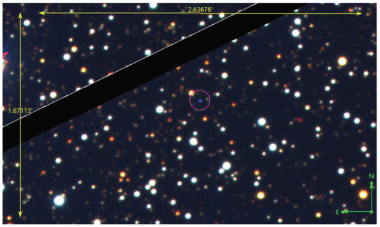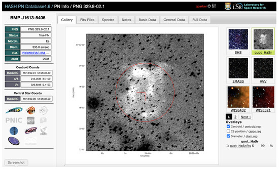 A 12 × 12 arcminute continuum subtracted ( divided by short red) SuperCOSMOS Survey (SHS: http://www-wfau.roe.ac.uk/sss/halpha/ (accessed on 5 February 2022)) image of the evolved bipolar PN BMP J1613-6406 and part of its host cluster NGC 6067 from the HASH (www.haspn.space (accessed on 5 February 2022)) database main image page showing various PN data and multiwavelength imagery. North is on the top East on the left.