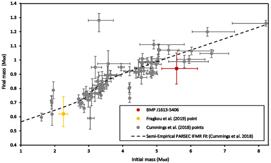 The IFMR [2] with our point in red. The yellow point refers to the only other instance of a PN (PHR 1315-6555) in an open cluster [7]. [Figure credit: [8].