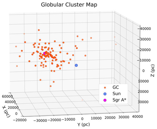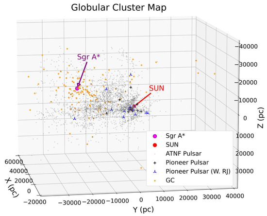 The blue point indicating Sgr A* represents the Milky Way’s center. The red point is the Sun, to show our position in the galaxy. The dark gray points are the known globular clusters from https://heasarc.gsfc.nasa.gov/W3Browse/all/globclust.html (accessed on 23 March 2022) by Harris (1996) [18]. The purple and orange points are known pulsars obtained from http://www.johnstonsarchive.net/astro/pulsarmap.html (accessed on 23 March 2022), purple points are translated from the Pioneer plaque picture and the orange points are the corresponding pulsars from the ATNF database. The silver points are additional pulsars that have been discovered, these from the ATNF database.