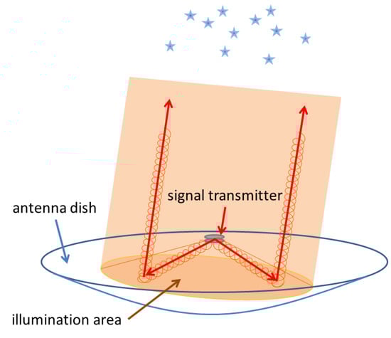 A diagram illustrating the FAST antenna dish and illumination area for receiving and transmitting signals.