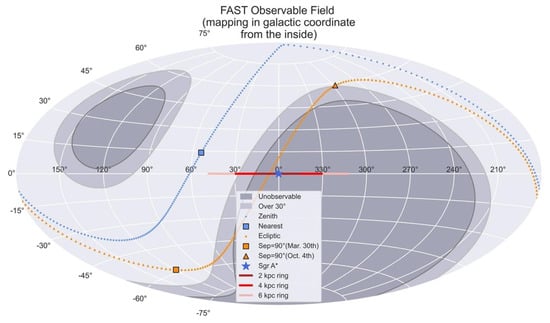 Located in Pingtang, Guizhou, China, FAST is the largest radio telescope in the world. Due to its huge aperture and extremely high sensitivity, it is expected to be used in the search for intelligent life off the Earth. The FAST’s design is similar to that of the Arecibo Observatory. The main mirror is built taking advantage of the local karst terrain and can be slightly deformed under the control of the actuator. Target pointing and tracking are realized by the movement of the suspended feed source bin. The declination of the observable sky area of FAST is limited by the geographic location of the telescope and the movement range of the feed source. FAST is located at Lon 106°51¢24.0² E, Lat 25°39¢10.6² N, the achievable pitch angle of the feed is between 40°, thus the corresponding sky declination is between –14.6° to 65.6° (https://nadc.china-vo.org/s/2019/20190115_notice/f2.pdf (accessed on 23 March 2022)).