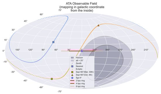 The ATA’s coordinates are Lon 121.47° W, Lat 40.82° N. Figure 5 shows the sky map drawn relative to the ATA location in the galactic coordinate system. Due to the ATA’s mount being movable, the telescope could observe all targets in the northern sky, and part ways into the southern sky with the horizon being the limit of the observable field. We assume the lowest observable altitude of the ATA is 25°, thus the southern target’s declination must be larger than −15.8°. The separation between the target and the Sun is not affected a given transceiver’s location on the Earth, thus we use the same dates derived in the FAST calculations for the ATA: 30 March and 4 October. To obtain the highest sensitivity, the target should reach the position where it is at its nearest point to the zenith, the corresponding time (UTC) would then be 14:10 for 30 March and the 01:50 for 4 October.