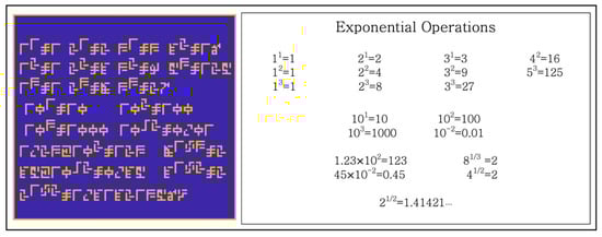The first two pages of the BITG message are designed as descriptions of human interpretation of universal concepts. The third page begins by introducing another such concept, exponentials. However, following the introduction of our numbering system for exponentials, the message begins to explore more distinctly human mathematics. Figure 9 is a pictural representation and content descriptor of page 3 starting with the most basic exponentials—again, what should be a universal concept. For example, the reliance of Newton’s law of gravity and Coulomb’s law on squared distances are just two naturally occurring scientific examples of inverse square laws. While the logical next step is introducing the inverse of exponentials, i.e., roots, the BITG message instead takes a sensible pause to allow for the introduction of scientific notation. Designed very much around base-10 mathematics and nearly indispensable when quantifying astronomical measurements, scientific notation is described by introducing the powers of 10 and their use of a moving decimal point. Only after this does the message begin to describe roots, finally displaying as a simple example the most commonly appearing root and its numerical value: (2)½ = 1.41421356... [14].