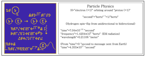 While mathematical communication is of utmost importance, a message solely containing a description of our mathematics would tell any ETI very little about the humans which sent it. Progressing further, one such way of informing intelligent aliens about how we perceive the physical universe is by describing our base measurement units using a universal constant—but what constant? The hyperfine transition (the “spin-flip transition”) of the hydrogen atom has been used before, and it makes sense to include it here as well. H2 is, by far, the most common compound in the entire cosmos, so the properties of hydrogen should be well understood by a technological intelligence. By using the wavelength of the EM radiation generated by spin-flip transition and the period of that radiation, the BITG message includes in Figure 11 the definition of a meter and second. This page serves two main purposes in the greater scope of the message: the first as the initial descriptor of how we perceive and the second being an introduction to units such that the message can describe different and more complex physical ideas.