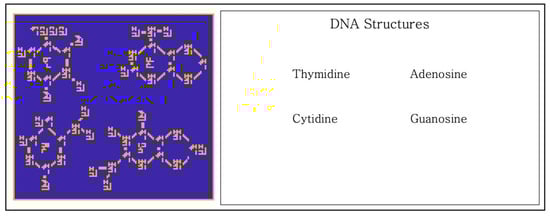 The BITG message is designed to follow as logical a progression as possible while adhering to essential basic communication protocols, all the while satisfying our relevancy test of including only such information as we would wish to receive from an ETI attempting communication with us. Hence, with basic math, physics and chemistry established the message progresses to the building-block basis of all life on Earth—DNA. Deoxyribonucleic acid, being composed of commonly occurring elements, is the clear follow-on to the introduction of lower atomic number chemical elements. Not only is the information a logical progression of the chemistry introduced earlier, but the knowledge that humans, and all life forms on Earth, are carbon-based is a crucial point in describing our world and its inhabitants. Accordingly, the four bases of DNA—Thymidine, Adenosine, Cytidine, and Guanosine—are depicted in Figure 13 using the previously introduced chemical elements in Figure 12 with the choice of included nucleobases being representative of the nucleobases found in the DNA of Homo Sapiens. [14].