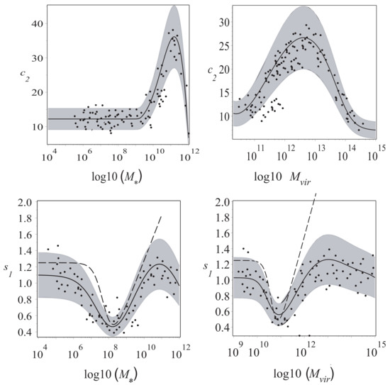 The NFW, Einasto, and related density profiles are independent of the mass scale. In [66], it was shown that the inner slope of the density profile depends on the halo mass. This result was later confirmed by several simulations both in the case of galaxies and clusters e.g., [67,68,69,70,71,72,73,74].
