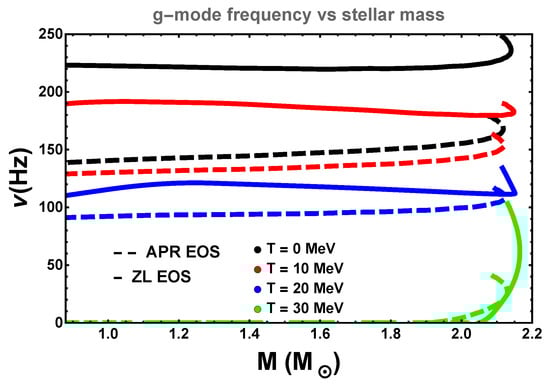 For composition-driven g-modes of zero-temperature neutron stars, the scale of the characteristic frequency is set by the Brunt-Väisälä frequency, and is of the order of 100–200 Hz. The g-mode frequency increases slowly with stellar mass, until a sharp increase occurs near the maximum mass. The g-mode frequency has been found to scale with the central lepton fraction [], and is sensitive (in matter) to the symmetry energy and its density derivative []. As Figure 1 shows, these modes are strongly dependent on the star’s temperature as well, with g-modes for canonical neutron stars (1.4 ) being suppressed at or above temperatures of 30 MeV or so. This is a direct result of an increase in the equilibrium sound speed with increasing temperature. Neutron stars close to the maximum mass of 2 in the APR or ZL EOS model can support stable g-modes even at higher temperature, but eventually at temperatures of 50 MeV or more, no stable g-modes can be found.