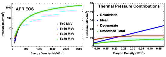 where the cold symmetry energy or symmetry pressure is denoted by or and . The thermal terms in the smoothed approximation are provided in Equations (A5) and (A6) below.