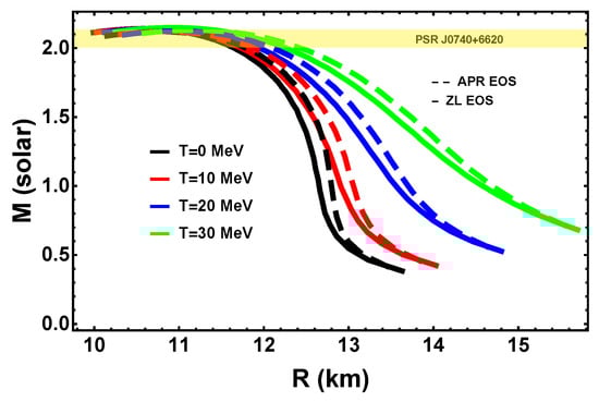 The mass–radius relations of cold and hot neutron stars described by the parameterized APR EOS and the ZL EOS are shown in Figure 3. The maximum mass of the T = 0 neutron star is 2.12 for the APR EOS and 2.15 for the ZL EOS, representative of the heavier neutron stars observed to date, giving us a sufficiently wide range to study the g-mode dependence on the mass. With increasing temperature (T from 0 to 30 MeV), the maximum mass for the APR EOS changes only slightly to 2.15 , while the size of the star increases, with dramatically larger radii near the upper limit of this range. Such high temperatures can be achieved a few tens of milliseconds after the merger in the core of the remnant, as suggested by results for the thermal profile emerging from merger simulations []. It should be noted that at this stage, the remnant is not in a state of mechanical or chemical equilibrium, so our mass–radius profiles are not directly applicable to such a scenario. However, it does demonstrate that the radial extent of the star is quite sensitive to the treatment of thermal pressure. Including the thermal terms leads to radius inflation and as we note below, affects the sound speeds and the behavior of the g-mode frequency.
