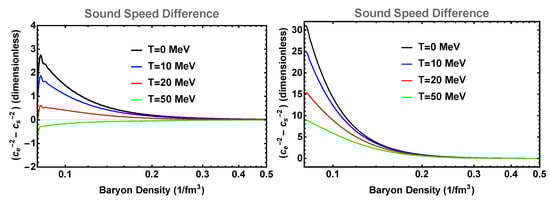 As the model in ROP is a good fit to realistic EOS across a range of asymmetries 0.01 < < 0.5 in matter, we also study the behavior of the sound speed difference with baryon density at fixed . Although the fixed scenario is not realized in neutron stars and does not apply to the g-mode perturbations which assume small deviations from -equilibrium, we display the results here to demonstrate the marked effects of composition on sound speeds. For example, Figure 4b shows that at low densities, even up to high temperatures, as matter in the core of a neutron star is, on average more degenerate than a configuration with fixed = 0.1 implies. The corresponding results for the ZL EOS are qualitatively similar, hence not shown here.