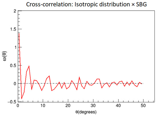 Example of Landy–Szalay cross-correlation estimator between a simulated isotropic dataset and positions of starburst galaxies. The red line is the value of estimator as a function of angular scale obtained for the data. The black dotted line shows the expected value in the isotropic case.