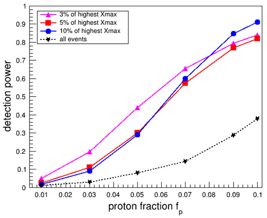 In Figure 2, we show the resulting detection power as a function of the proton fraction for different fractions of selected events . The net gain when we use a small subset containing the highest depends of the proton fraction, ranging from a factor of ∼2 to ∼4.