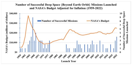 where A is a proportionality coefficient, L represents the technology level, and B represents NASA’s budget. As NASA’s annual budget, which generally grows even after adjusting for inflation, continues to fund deep space exploration, the effective radius of human activity continues to expand. The differential form of Equation (3) reflects the overall time dependency of this characteristic as well. The linearly multiplicative term L can be interpreted as technological development effectively acting as a scalar on subsequent research, development and, ultimately, resulting in investment reduction if R were to remain fixed.