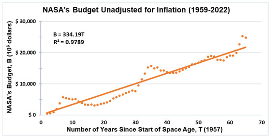 Figure 2, notes a non-inflation-adjusted gradual rise. The trend can be easily plotted in a functional manner with the linear horizontal axis being the number of years since the start of the Space Age. A simple linear relationship is then best fit to the plotted data, yielding: