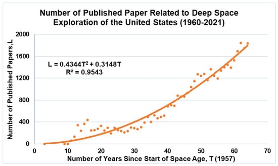 Deep space exploration involves a variety of technologies such as computing power, which is leveraged in the design, manufacture, and operation of hardware, e.g., launch vehicles and guidance systems, as well as for life support where human crews are present. It is difficult to quantitatively describe the development of technology as a whole by the specifics of any one area of technology. However, as a first approximation the number of published papers on deep space exploration of the United States each year can be used as a proxy to gauge the overall technology level of cutting-edge developments in this complex realm. Directionally speaking, the greater the number of papers, the higher the (generalized) technology level rises and thus a scalable rate of development can be derived from this trend. Mapping the number of papers published per year (L) starting from the mid-1960s yields a dataset that can then be fitted by a quadratic function (