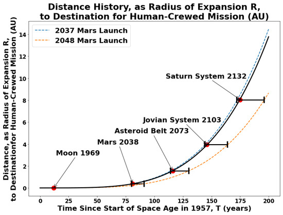 14]. Although the applied energy optimizing Hohmann transfer orbit launch windows from Earth to Mars in the latter 2030s will actually occur in 2037 and 2039, for the purposes of this analysis we will pragmatically assume the average, thus the assumption for the first crewed mission to Mars successfully launching in 2038. The distance between Mars and Earth’s orbit is 0.3763 AU, so for T = 81 years {2038 minus 1957}, R = 0.3763 AU. Using these two points, (12, 0.0026) and (81, 0.3763), the complete expression for R is rendered as: