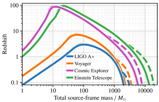 The stellar history of the universe extends from the present day back to a redshift higher than 10, beyond which the matter in the universe was predominantly neutral hydrogen. Even the oldest stars that astronomers have observed today, belonging to the so-called Population II, have a metal content that is too high to be explained by direct formation from this neutral hydrogen, leading to a hypothesized cohort of stars (Population III) that would have produced the first phase of stellar nucleosynthesis in the universe [41]. No such Population III star has been observed, but simulations suggest these stars were typically larger than 100 . If they were sufficiently massive, they would have collapsed into black holes [42,43], implying rich observational prospects for high-redshift gravitational-wave astronomy. Cosmic Explorer will be able to search for the remnant black holes of binary Population III systems at redshift beyond 10 over two decades in mass, about 3–300 ; see Figure 1 and Figure 2).