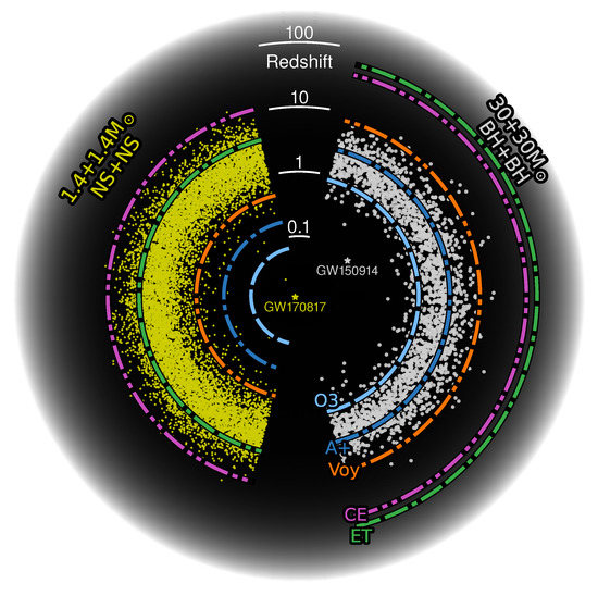 The cosmic history of binary stellar remnant mergers, with 1.4 + 1.4 neutron star mergers on the left and 30 + 30 black hole mergers on the right; the radial coordinate is cosmological redshift z. The distribution of mergers as a function of redshift assumes the Madau–Dickinson star formation rate and that the typical time from binary formation to merger is 100 million years [37,38]; under these assumptions, most of these binaries merge at . The first gravitational-wave detections of a binary black hole merger (GW150914) and a binary neutron star merger (GW170817) are indicated [39,40]. The colored bands then show the detection capabilities of selected gravitational-wave observatories from Figure 1, as well as the capability of Advanced LIGO during the third LIGO–Virgo observing run.