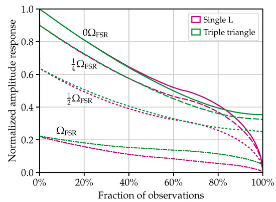 Each next-generation curve in Figure 3 represents the strain noise of the observatory as a whole corresponding to an optimally oriented and polarized source on the sky at each Fourier frequency. Computing this optimum requires recourse to the antenna response functions (for + polarized waves) and (for × polarized waves) of each detector in the observatory, keeping in mind both the source location on the sky and the angular frequency of the arriving waves [89]. In the case of the Einstein Telescope, arriving at the total observatory strain noise requires summing the power collected by each of the three detectors (in other words, treating the Einstein Telescope as a network of three colocated, but rotated, detectors). For Cosmic Explorer, especially, the stipulation of computing the sensitivity separately at each Fourier frequency is important because the optimal sky location and polarization varies significantly with frequency: for a single L-shaped detector such as Cosmic Explorer, the optimum sky location for a zero-frequency source is directly at the detector’s zenith or nadir; however, for a source with (the free spectral range), the detector is completely insensitive to a source arriving at the zenith or nadir, and the maximum response instead occurs for sources arriving at other angles [90,91]. Figure 4 compares the normalized observatory sensitivities as the gravitational-wave frequency approaches the free spectral range, showing that the antenna pattern of an L-shaped detector is reduced, but not identically zero, at the free spectral range. It also evinces a lack of nulls in the total antenna pattern of the three-detector triangle geometry employed by the Einstein Telescope [20].