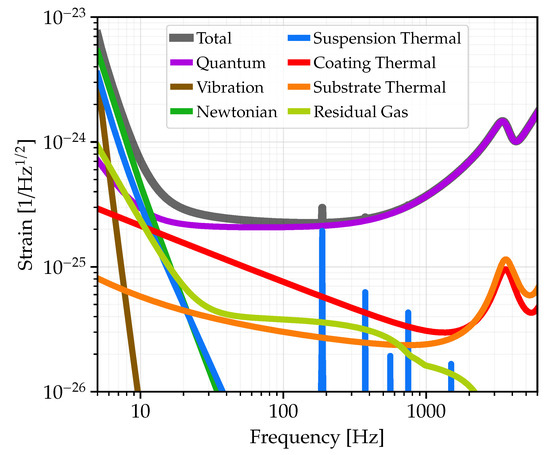 - Rollins, J.G.; Hall, E.; Wipf, C.; McCuller, L. pygwinc: Gravitational Wave Interferometer Noise Calculator. 2020. Available online: https://ascl.net/2007.020 (accessed on 14 April 2022).