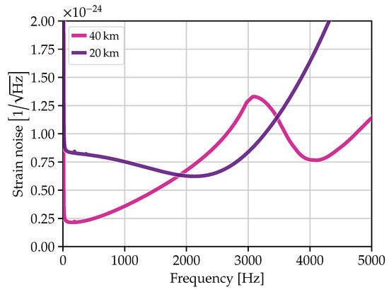 The choice of optical cavity lengths and mirror transmissivities influences many of the noise sources in the detector, particularly the noise arising from quantum mechanical fluctuations of the optical field. In terms of equivalent spacetime strain, most noise sources in the detector decrease with increasing arm length [23,24]; in particular, the amplitude spectral density of quantum shot noise scales as if the detector bandwidth is held fixed. On the other hand, the free spectral range limits the maximum bandwidth of the instrument; thus, to achieve the science goals relating to postmerger neutron star physics (Section 2.2.2), the detector cannot be longer than several tens of kilometers. The choice of 40 km represents a trade-off, yielding a free spectral range of 3.7 kHz while still offering a clear improvement in the shot-noise-limited performance compared to a detector with a shorter baseline. Further consideration of arm length choice is found in Section 3.5.