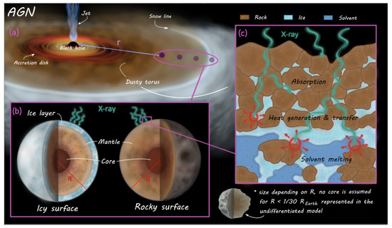 Regarding the active galactic nuclei (AGNs), this work will focus mainly on radio-quiet ones as external energy sources with X-ray emissions strong enough for their radiation to mostly penetrate both otherwise optically thick circumnuclear material1 and the upper regions of regolith on bodies in their vicinity (which encompasses several parsec for objects such as these). This coincides with a recent proposal of planetary formation in the snowline around Seyfert-type AGNs [6], but despite this overlap, we want to avoid strict adherence to the planetary properties considered in that work to keep a broad perspective on this uncommon field and check a reasonably wide slew of possibilities. A graphic overview of the model is given in Figure 1.