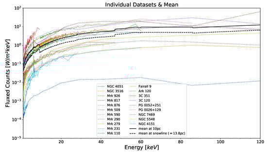 Data of individual X-ray spectra based on a catalog of AGNs [8] (between 1 and 120 keV) of 20 Seyfert 1 AGNs used in this work (colored and dotted) as they would be observed at a distance of 10 pc, as well as the mean of their spectra as it would be observed a distance of 10 pc (black, solid line) and at a snowline distance of 13.8 pc (black, dashed line), with the snowline distance determined cutting off at 1.24 eV instead of 1 keV. (CC BY 4.0).