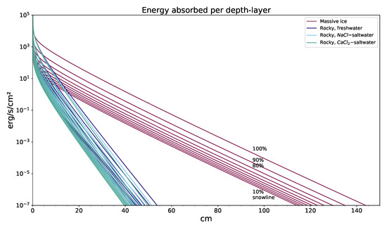 Energy flux absorbed at a certain depth in 4 surface models, with a family of graphs from 10% to 100% snowline distances (descriptions of which are only shown for pure ice models for improved legibility in the graph), with different water-mixtures being very close to each other in the rocky model. What can be clearly seen is that saltwater compositions have a small but noticeable impact on absorption, although the main determining factor of the absorption is material density.